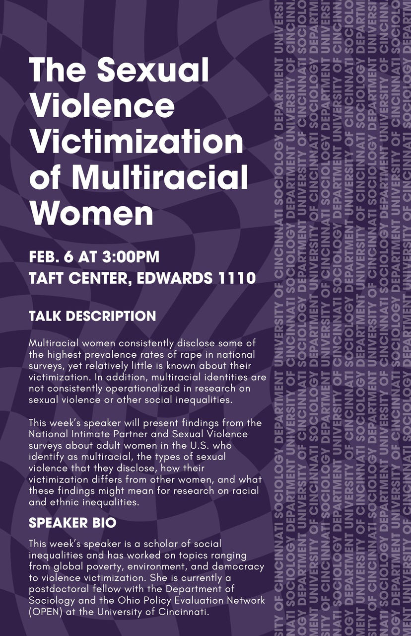 This week's speaker will present findings from the National Intimate Partner and Sexual Violence surveys about adult women in the U.S. who identify as multiracial, the types of sexual violence that they disclose, how their victimization differs from other women, and what these findings might mean for research on racial and ethnic inequalities.