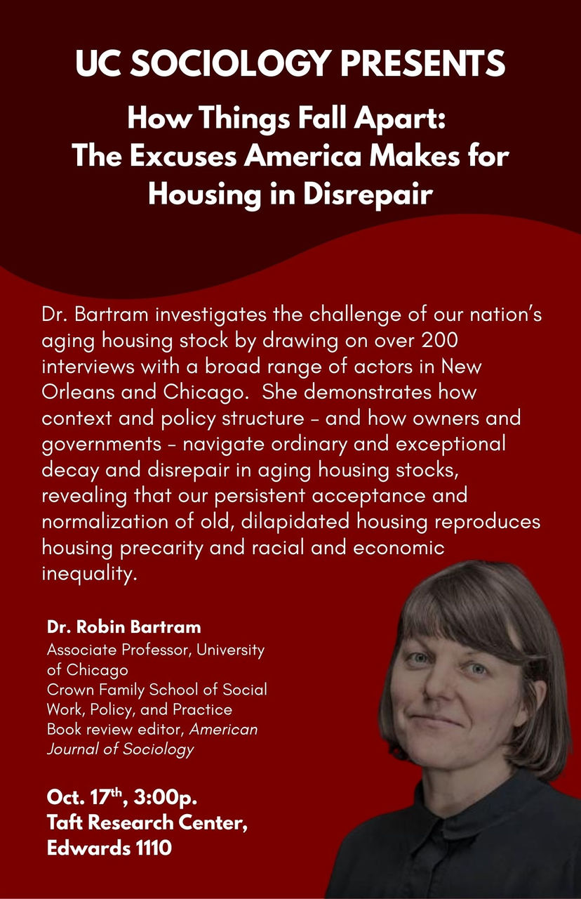 How Things Fall Apart investigates the challenge of our nation’s aging housing stock. The book draws on over 200 interviews with a broad range of actors – from homeowners and landlords to grassroots organizers and city officials – in New Orleans and Chicago. The book demonstrates how context and policy structure – and how owners and governments navigate – ordinary and exceptional decay and disrepair in aging housing stocks, revealing that our persistent acceptance and normalization of old, dilapidated housing reproduces housing precarity and racial and economic inequality.