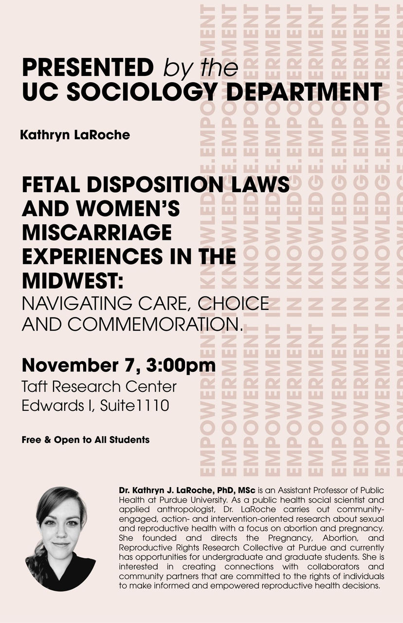 Dr. LaRoche has ongoing projects in the United States, Canada, and Australia. She founded and directs the Pregnancy, Abortion, and Reproductive Rights Research Collective at Purdue and currently has opportunities for undergraduate and graduate students. She is also interested in creating connections with collaborators and community partners that are committed to the rights of individuals to make informed and empowered reproductive health decisions.